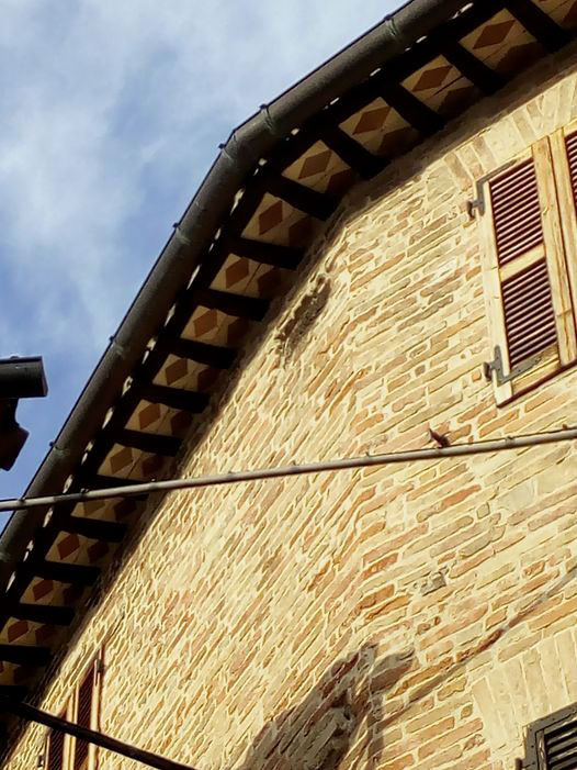 Ascoli Piceno ha una caratteristica particolare, oltre alle tante altre presenti nella sua architettura del centro storico. Il pianellato degli sporti dei tetti è decorato con motivi geometrici: triangoli, losanghe , quadrati e simili. Molto affascinanti e delicati, manifestazione di cura e piacere della decorazione in architettura. Siccome Ascoli non è tanto lontana da Sarnano, da anni ho cercato e ricercato tali decorazioni negli sporti dei tetti del paese, ed ovviamente le ho trovate, perché sapevo cosa cercare senza smontare o demolire “gnorantemente” qualsiasi cosa, per mancanza di conoscenza delle parti architettoniche di un edificio storico, chiaro no? Ho trovato queste decorazioni nel palazzo davanti al Comune di Sarnano in via Leopardi, e dovendolo restaurare ho riproposto quello che già era in loco, anche se molto sfocato. Alcuni campioni li ho conservati in studio. Il palazzo adiacente al mio studio, nella via dell’”Ortere”, aveva le pianelle dello sporto così decorate. Tanti anni fa feci appena in tempo a fotografarle, perché furono distrutte il giorno dopo a causa del restauro “gnorante” del palazzo. Allego una foto dello sporto del tetto dell’edificio davanti alla sede comunale, nessuno ha mai notato queste decorazioni, perché altrimenti me lo avrebbero detto, quindi, sarnanesi quando passeggiate nel centro storico, guardate anche in alto, perché ci sono cose e decorazioni bellissime ed affascinanti, create dai nostri antenati per il solo piacere del bello, della decorazione, che oggi manca colpevolmente.